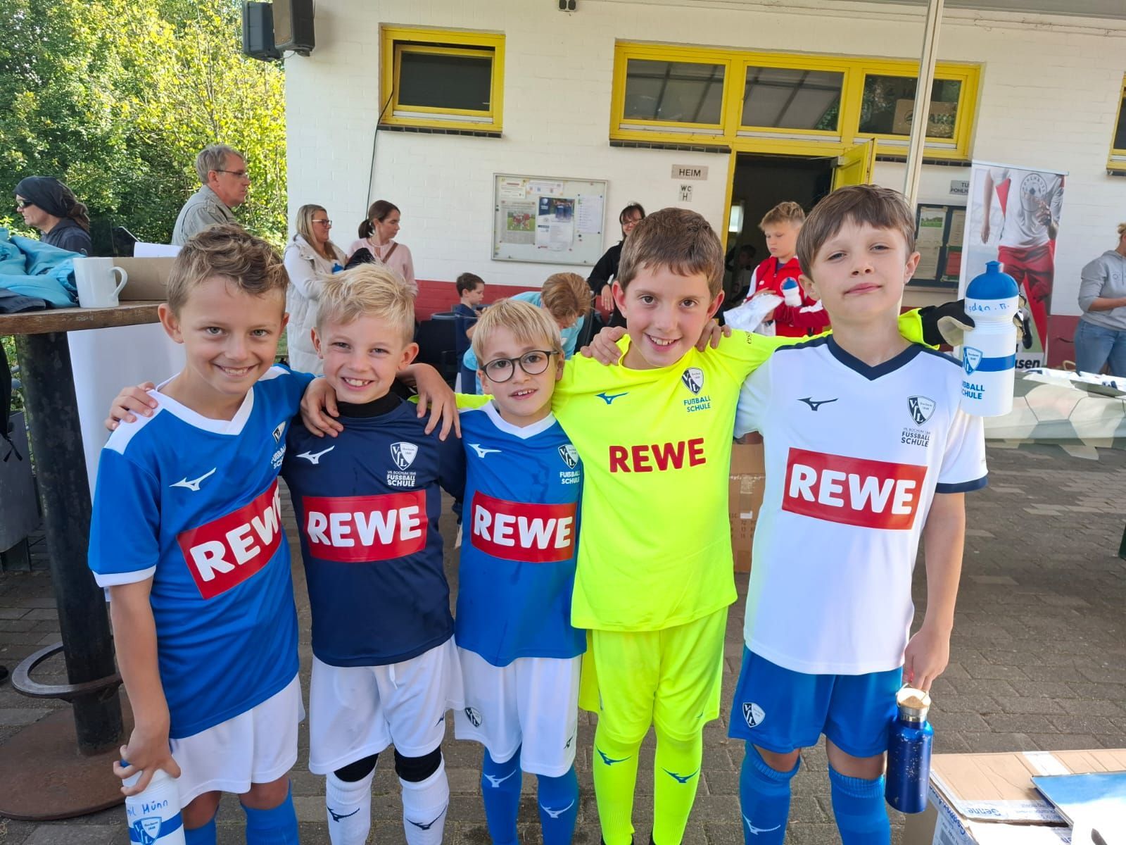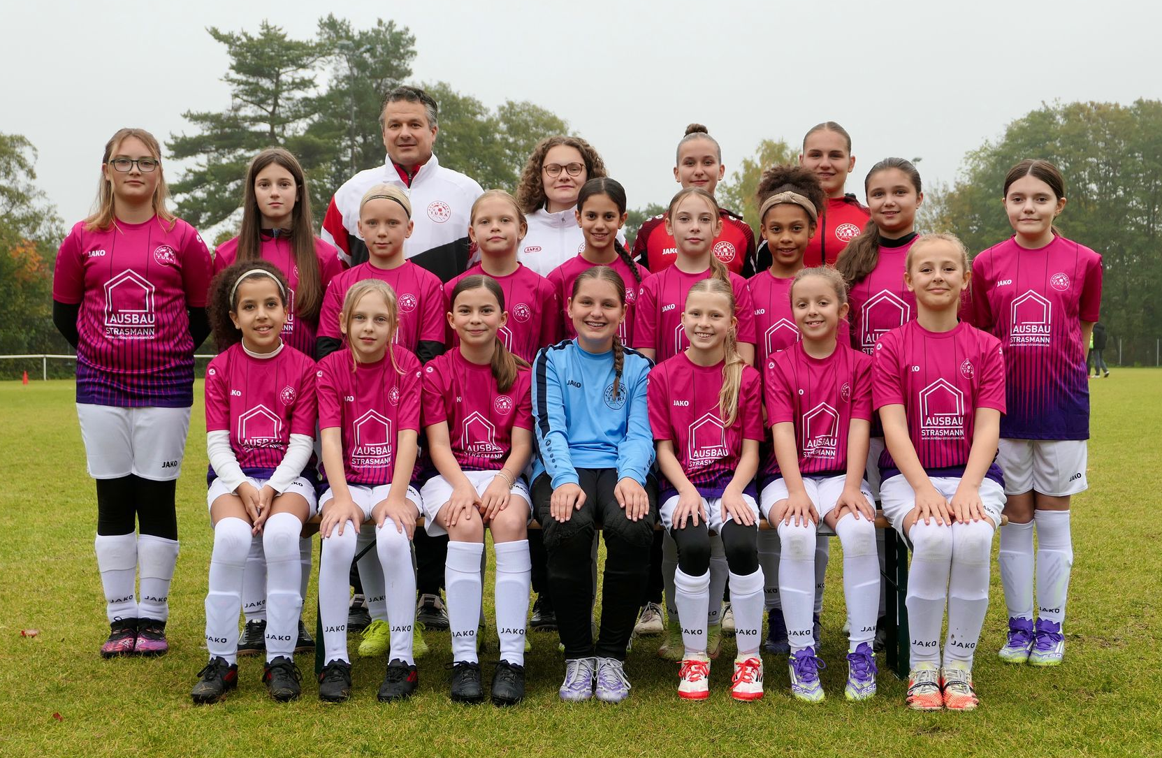 Mädchen E-Jugend präsentiert voller Stolz ihr brandneues Trikot.