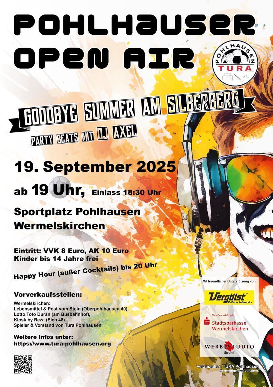 “Party Beats“ mit DJ Axel verspricht das 29. Pohlhauser Open Air am Freitag, 19. September, ab 19.00 Uhr am Sportplatz in Pohlhausen. Unter dem Motto “Goodbye Summer am Silberberg“ sorgt DJ Axel mit einem bunt gemischten Repertoire bekannter Lieder für Stimmung und gute Laune. Und das für Jung und Alt, wobei Kinder bis 14 Jahre freien Eintritt haben und bis 20.00 Uhr bei Getränken -außer Cocktails- die “fröhliche Stunde“ (Happy Hour) lacht. Der Eintritt beträgt € 10,--, im Vorverkauf bei den Kiosken an der Eich und am Bahnhof, Lebensmittel/Post vom Stein und Tura Mitgliedern € 8,--. Wir laden alle Mitglieder, Freunde und Gäste herzlich ein, gemeinsam den Sommer bei toller Musik, Essen und Trinken unter freiem Himmel oder bunt beleuchtetem Zelt langsam ausklingen zu lassen.