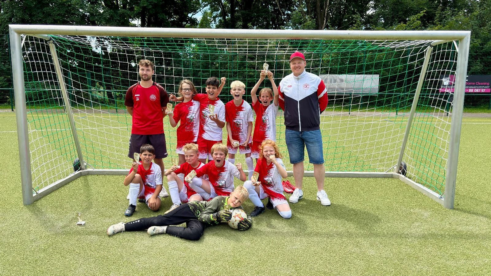 Unsere E-Jugend hat sich beim letzten Turnier der Saison noch einmal von ihrer besten Seite gezeigt – und sich mit einem beeindruckenden Turniersieg in die Sommerpause verabschiedet. In fünf Spielen blieb die Mannschaft ungeschlagen und zeigte dabei sowohl spielerisch als auch kämpferisch eine starke Leistung. Besonders bemerkenswert: Das Team kassierte im gesamten Turnierverlauf kein einziges Gegentor! Zum Auftakt gab es ein torloses 0:0 gegen den SV 09/35 Wermelskirchen. Danach nahm die Offensive richtig Fahrt auf: Mit einem 3:0 gegen Tura Süd 2, einem 2:0 gegen Rade, einem klaren 4:0 gegen BV 10 und einem abschließenden 3:0 gegen Tura Süd 1 sicherte sich die Mannschaft vier souveräne Siege in Serie. Mit einem Torverhältnis von 12:0 und jeder Menge Teamgeist beendete unsere E-Jugend die Saison 24/25 auf beeindruckende Weise. Glückwunsch an das gesamte Team und das Trainerteam – ihr habt eine großartige Entwicklung gezeigt. Jetzt heißt es: Sommerpause genießen und Kraft tanken für die nächste Saison!